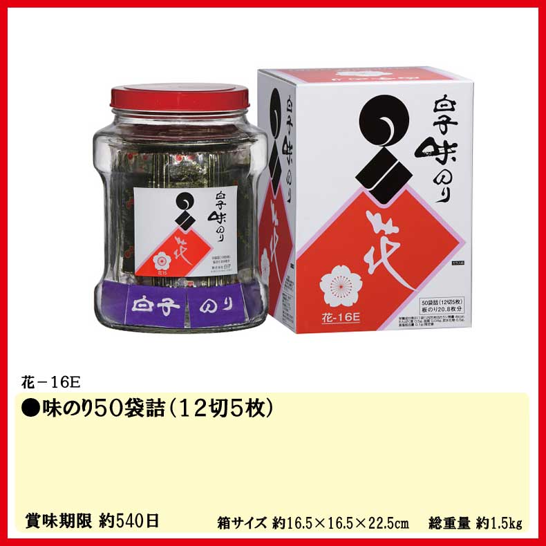 ●味のり50袋詰(12切5枚)商品サイズ(cm) 約(高さ)22.50×(幅)16.50×(奥行)16.50総重量(g)約1500.00